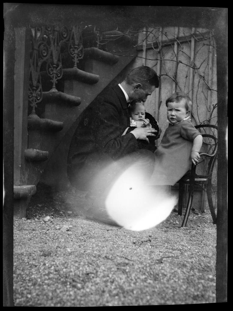 undir stiga við hús. Önnur stelpan situr á barnastól. Thorvald Krabbe með