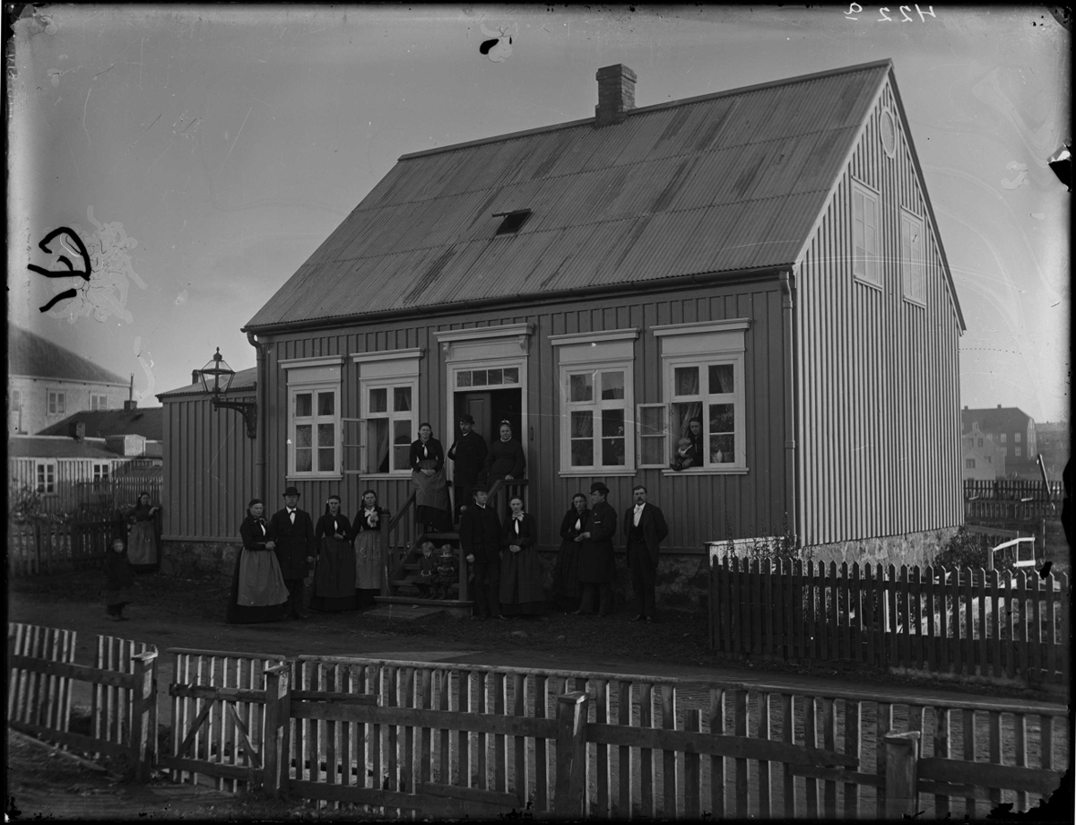 Timburhús með áfastri lukt. Fjórir menn, 8 konur og 3 börn standa við tröppur og glugga hússins. Sér í grindverk og hús beggja megin við húsið. Stúlka stendur við húshornið. Lítil stelpa er á götunni. Tímasetning miðar við aldur barnanna í tröppunni.