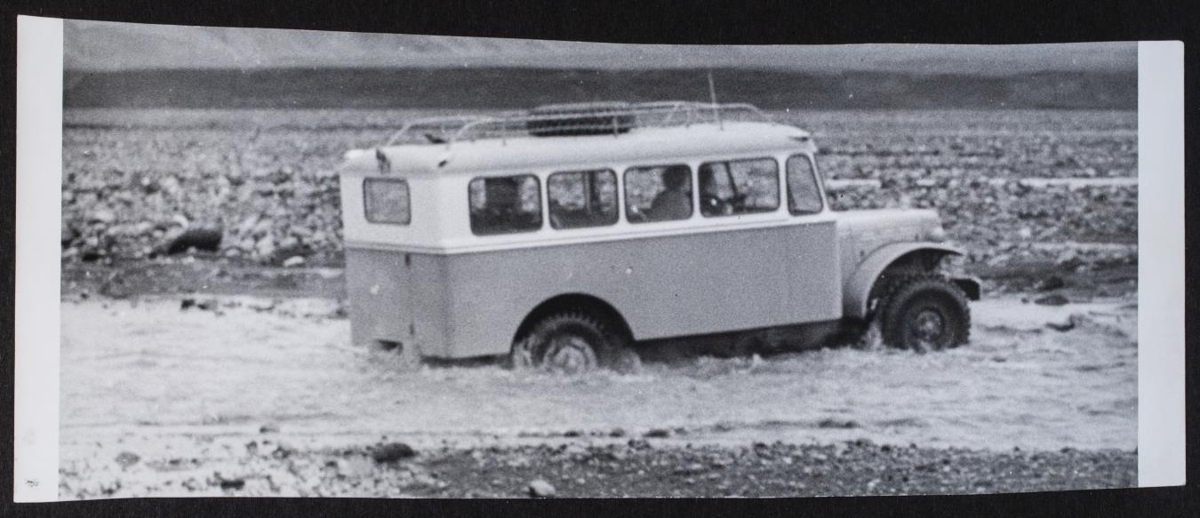 Hópferðabifreið á leið yfir á.