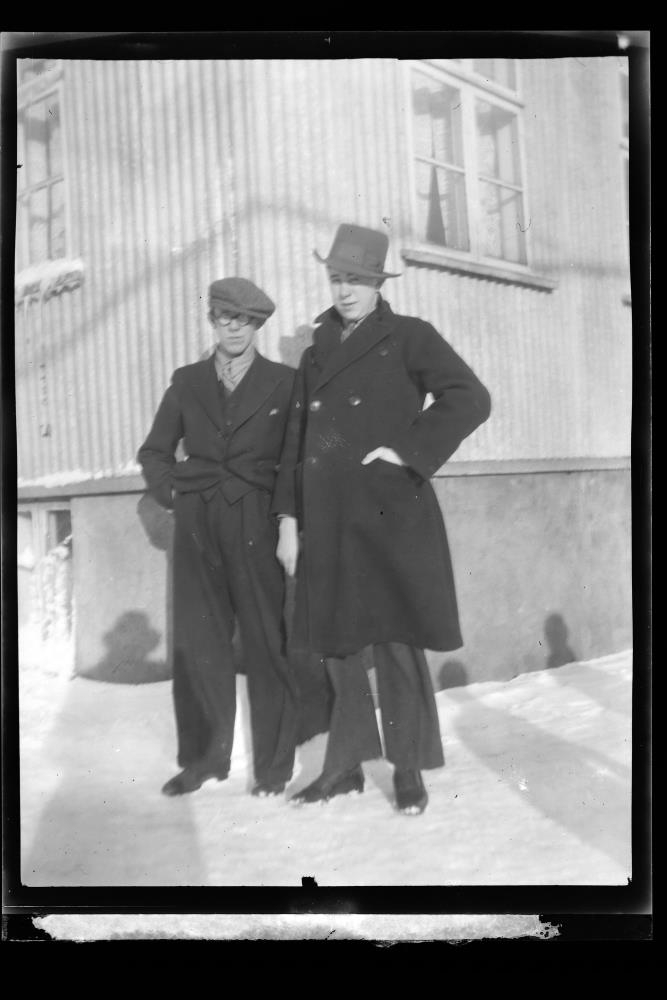 Tveir menn við húsvegg að vetrarlagi.