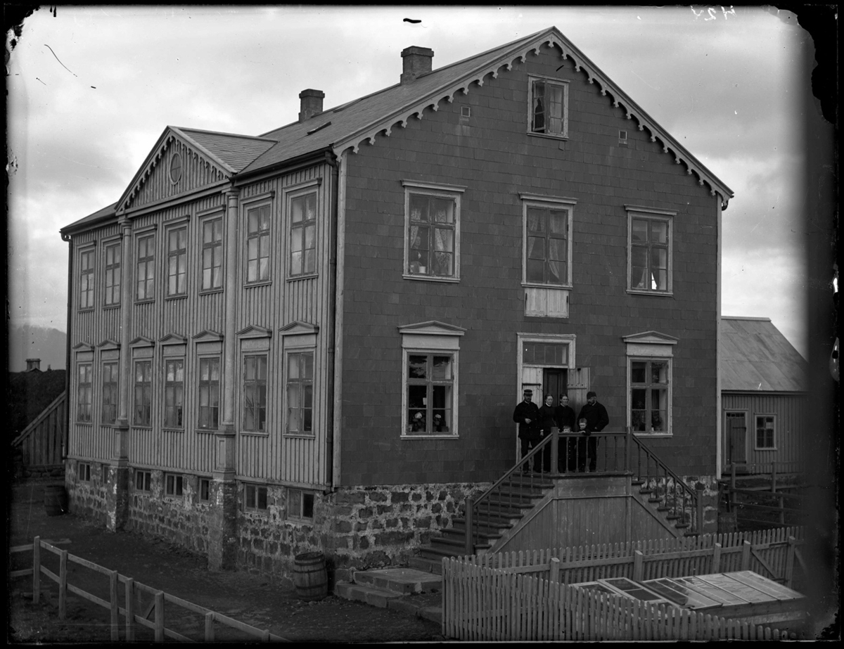 Tveggja hæða timburhús á steinhlöðnum kjallara reist 1879-1880. Vatnstunna undir rennu. Vermireitur með gleryfirbyggingu. Sér í næstu hús. Á tröppunum við húsið standa tvenn hjón og tvö börn.