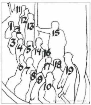 „Eylenda I: Gustur Bárar-Ólafsson.Myndin er tekin árið 1897. 1. Jörgen Ludvig Moul húsmaður í Flatey, f. 1834, d. 1906, 2. Ólafur Ólafsson húsmaður í Flatey. F. 1835, d. 1915, 3. Ögmundur Ólafsson járnsmiður í Flatey, f. 1834, d. 1894, 4. Jón Jónsson Flateyingur, formaður, f. 1830, d 1908, 5. Jón Jónsson „rímann“, sjómaður í Alheimi, f. 1842, d. 1914, 6. Sigurborg Ólafsdóttir, f 1881, d. 1956, síðan kona Boga Guðmundssonar kaupmans, 7. Sigurborg Ólafsdóttir, f 1846, f. 1903, kona Eyjólfs Einars Jóhannssonar kaupmans og bónda í Eyjólfshúsi. 8. Jónína Guðrún Eyjólfsdóttir f. 1887, d. 1989, síðar kona Guðmundar Bersteinssonar kaupmans í Flatey. 9. Salbjörg Þorgeirsdóttir, f. 1914, d 1913, kona Jóhanns Eyjólfssonar bóndi og hreppstjóri í Beykihúsi, 10. Jón Daníelsson hreppstóri á Kverná í Grundarfirði, er síðast hjá Eyjólfi og Sigurborgu, 11. Sæmundur Björnsson búfræðingur í Flatey, f. 1862, d. 1921. 12. Sigurður Eiríksson beykir, átti heima í Danmörku en dvaldi á sumrin í Flatey, 13. Bogi Gunnlaugsson sjómaður í Flatey og síðar á Hellisandi, f. 1851, d. 1935, 14. Jóhann Eyjólfsson bóndi og hreppstjóri í Flatey, f. 1819, d. 1900. 15. Eyjólfur Einar Jóhannsson kaupmaður og bóndi í Flatey, f. 1852, d. 1900. 16. Guðrún Þorgeirsdóttir ráðskona í Flatey f. 1860, d. 1937, 17. Guðrún Guðmundsdóttir, 1844, d 1914, kona Ólafs Ólafssonar í Flatey, 18. Dóróthea Jarþrúður Ólafsdóttir, f. 1841, d. 1908, dóttir Bárar-Ólafs, 19. Ólafur Guðmundur Eyjólfsson, f. 1874, d. 1938, síðar kaupmaður og skólastjóri Verslunarskóla Íslands í Reykjavík.“ (APS 2022)