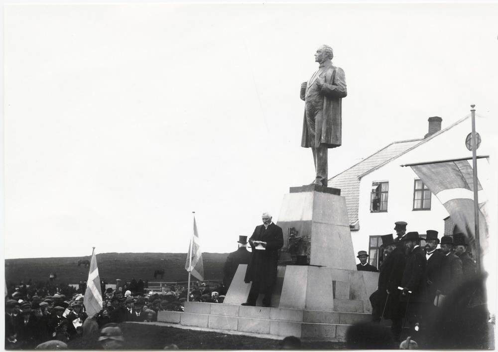 Frá afhjúpun styttu Jóns Sigurðssonar fyrir framan Stjórnarráðshúsið. Kristján Jónsson ráðherra að flytja ræðu.