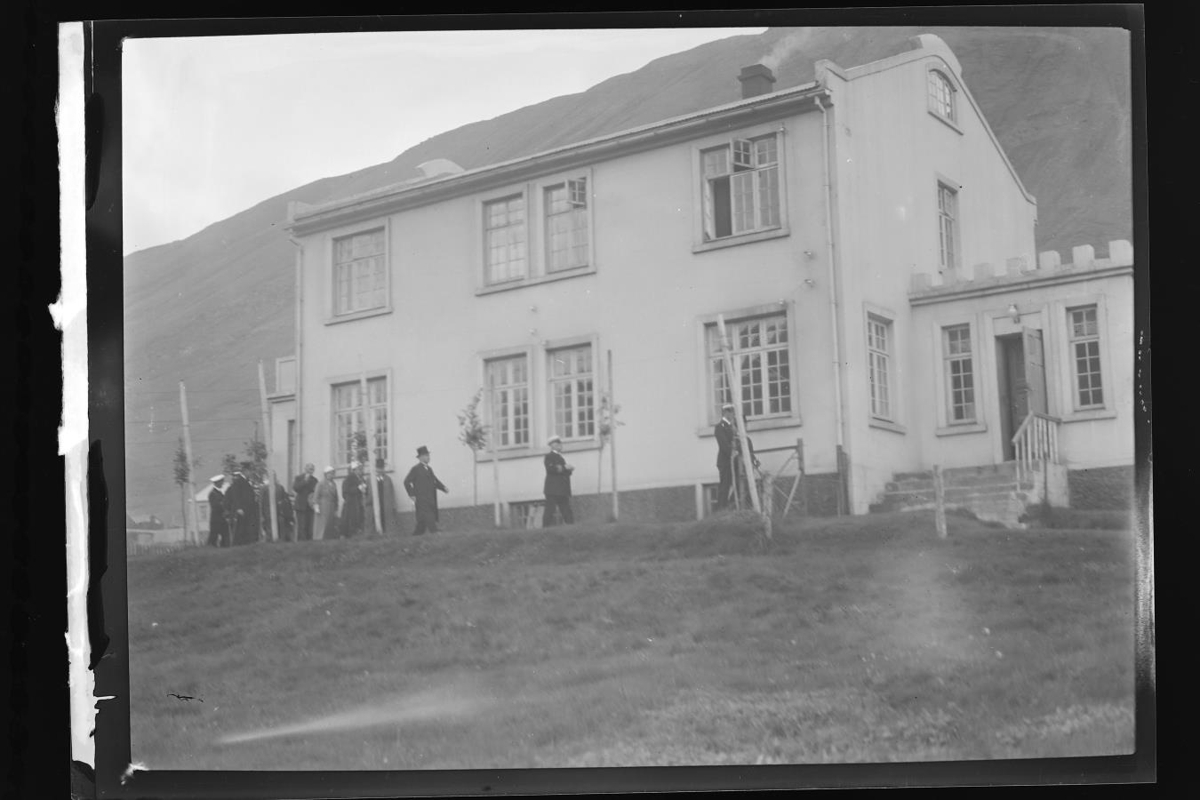 Siglufjörður. Heimsókn Friðriks krónprins. Hópur manna framan við tvílyft hús með viðbyggingum til beggja enda og er eins konar hallarkantur eða takkakantur til skrauts á þakbrún annarrar. Íbúðarhús bæjarfógetans.