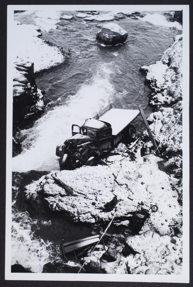 Vörubíll ofan í á, í klessu. Snjóföl