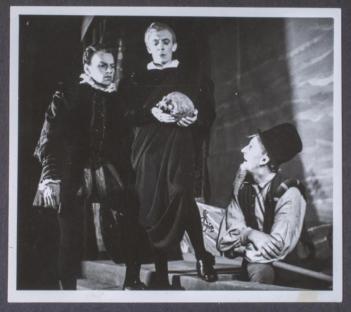 „Frá vinstri: Jón Sigurbjörnsson (Hóras), Lárus Pálsson (Hamlet), Brynjólfur Jóhannesson (1. grafari). Hamlet frumsýndur 11. maí 1949. Leikfélag Reykjavíkur.“ (PBB 2023)