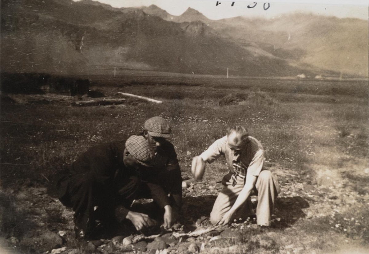 iðju, einn þeirra virðist slá með einhverju á jörðina. Fjallendi í baksýn