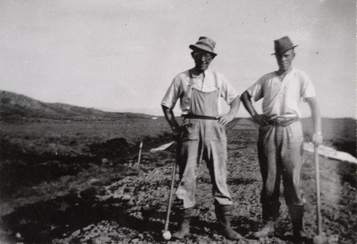 hlið og hvílir hvor um sig hönd á sleggju. Flatlendi í baksýn.