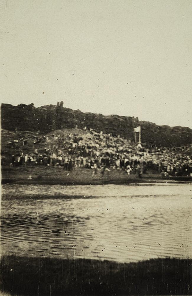 í baksýn er töluverður mannfjöldi í brekku við klettavegg. Fáni við hún