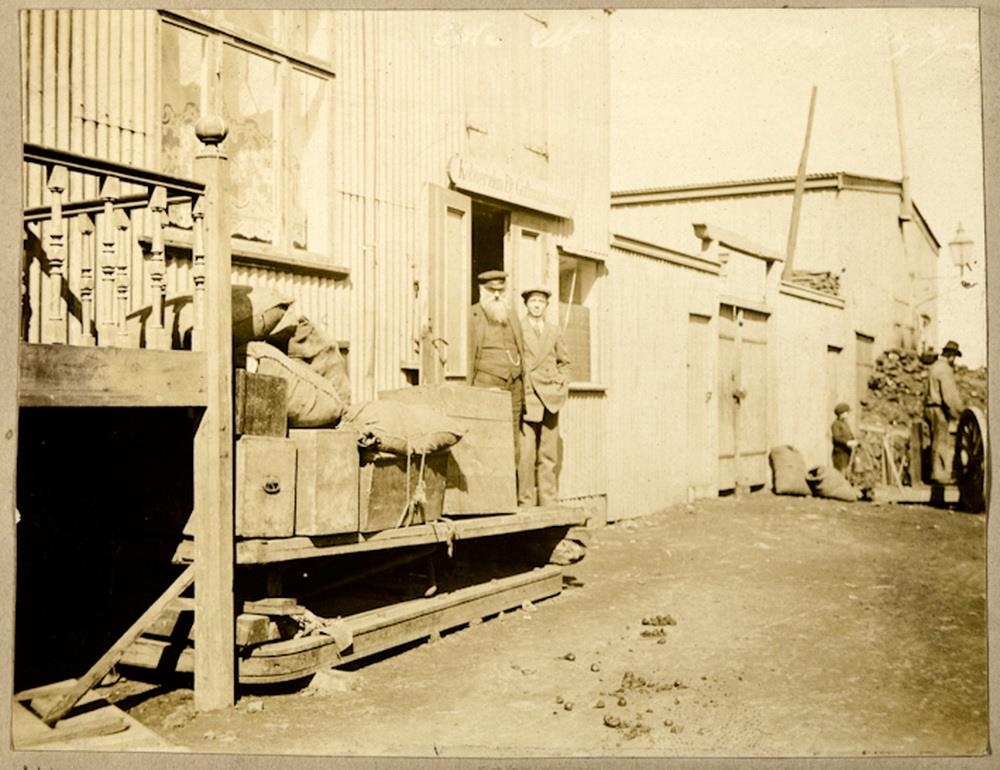 Við hús. Tröppur, ýmiss konar varningur kistlar og strigapokar á trépalli. Tveir menn standa í dyrum. Skilti yfir dyrunum með áletruninni: Kolaverzlun Bj. Guðmundssonar. Menn og drengur við vigt fjær.