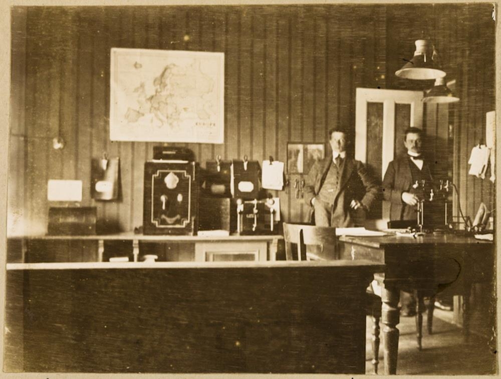 Innan úr skrifstofu. Tveir menn standa við skrifborð. Landakort á vegg, eldtraustur skápur, sími ofl. á borðum.