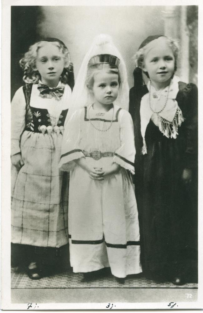 Þrjú stúlkubörn á þjóðbúningum, hver um sig í mismunandi búning. Ein á upphlut, önnur peysufötum og þriðja í drögum að skautbúning.
