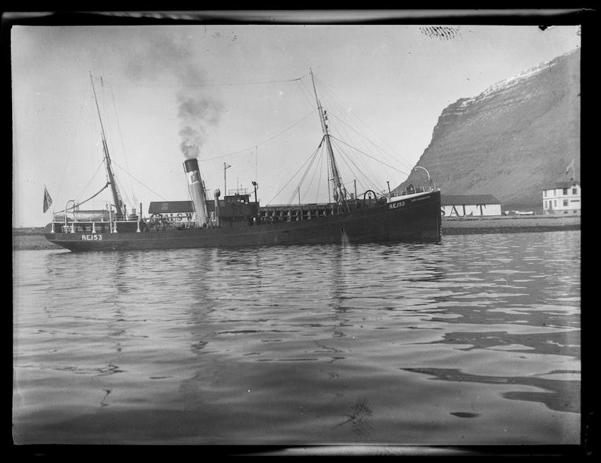 14. Vatneyri. Patreksfjörður. Togari við bryggju, séð frá hafi. Einkennisstafir og heiti ógreinilegt; Kári Sölmundarson RE 158?