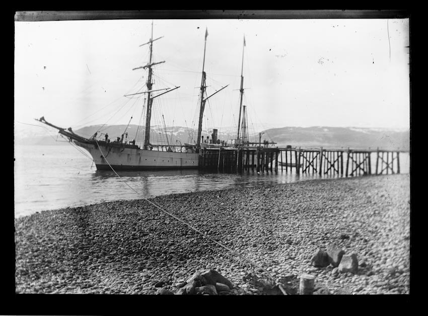 23. Vatneyri. Patreksfjörður. Þriggja mastra skúta við trébryggju. Fjara í forgrunni.
