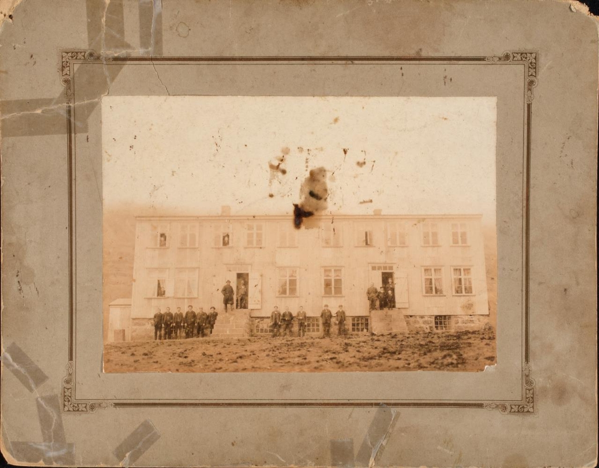 Vinstra megin við tröppur f.v. Egill Benediktsson, Guðlaugur Jónsson, Bjarni Eiríksson, Matthías Helgason, Guðlaugur Jóakimsson, Torfi Eymundsson.