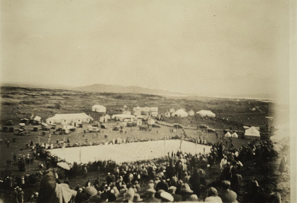 þar sem stór völlur er við rætur brekku og nokkrir bílar og tjaldborg eru