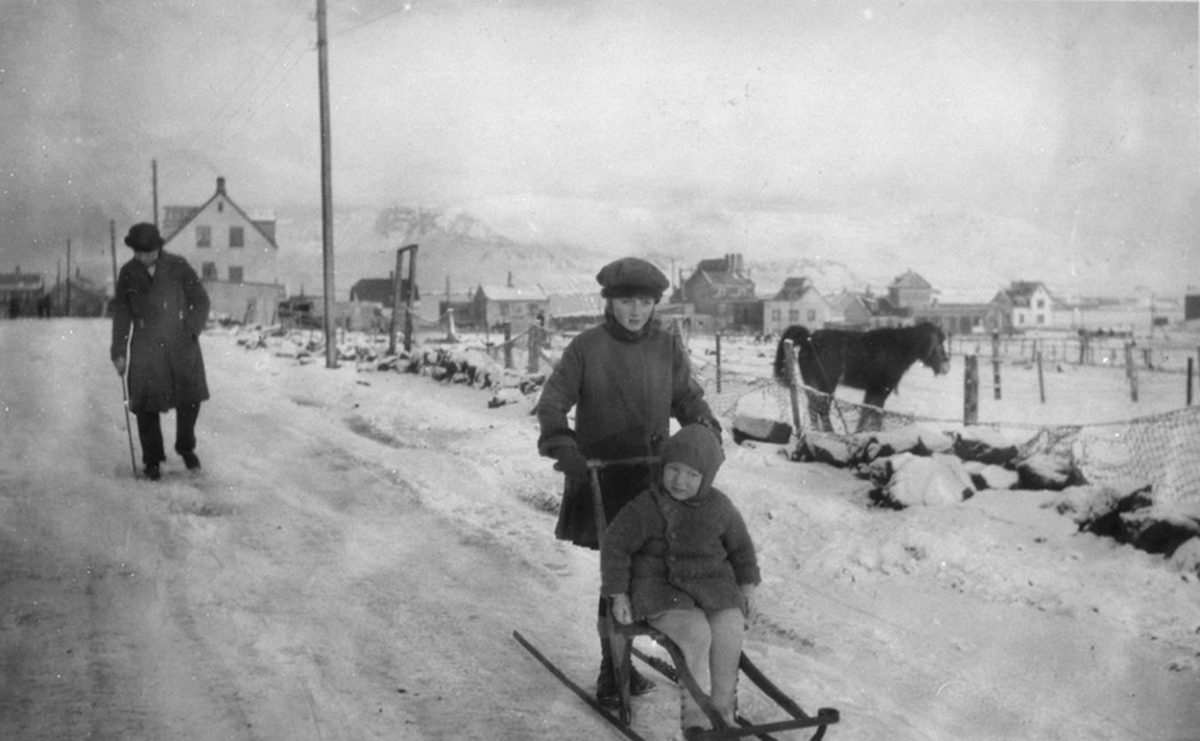 Eftirtökumynd. Fremst er unglingsstúlka á skíðasleða á vegi og situr barn í sætinu. Nokkru aftan við sleðann gengur fullorðinn karlmaður á veginum, t.h. stendur hestur innan girðingar. Í baksýn eru nokkur íbúðarhús á stangli og fjöll í fjarska.
