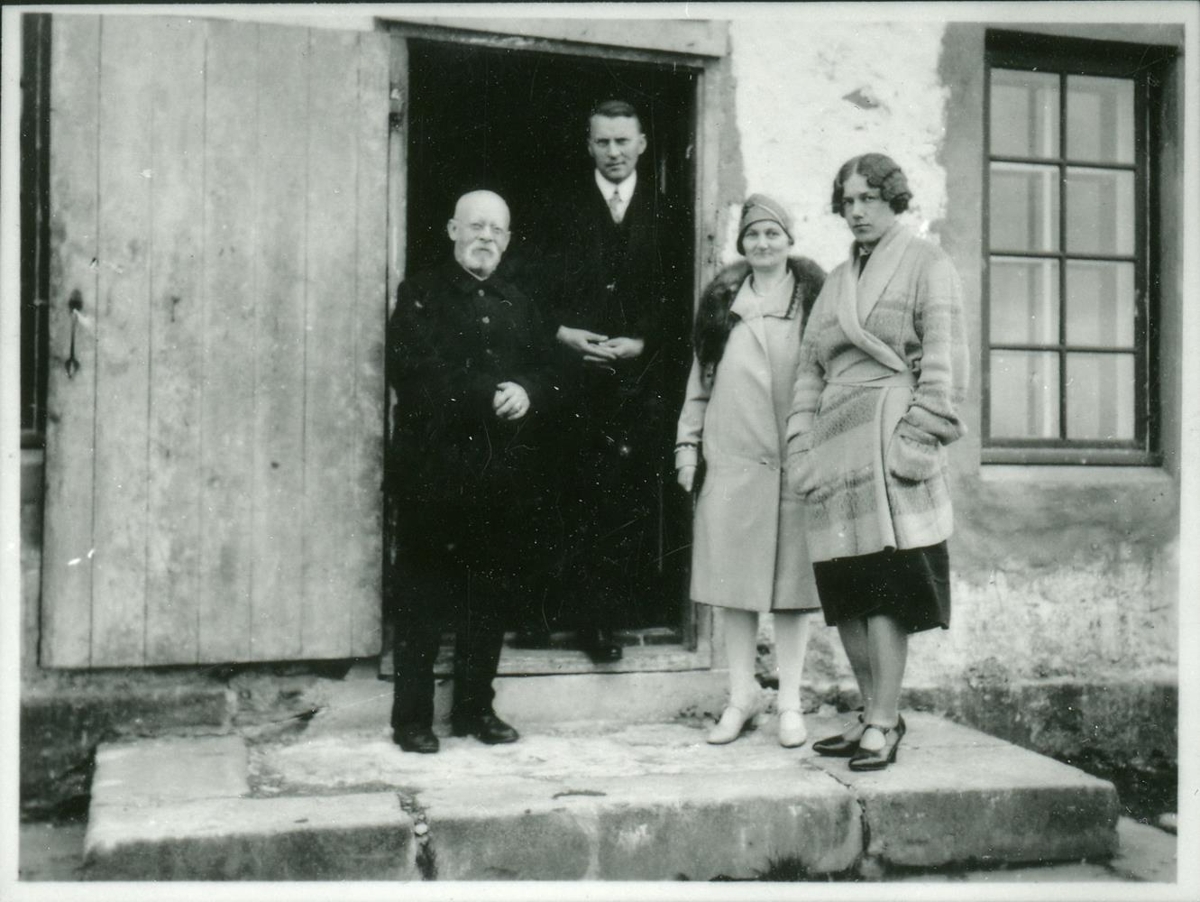 Eftirtökumynd. Tveir karlar og tvær konur standa á palli við húsdyr.