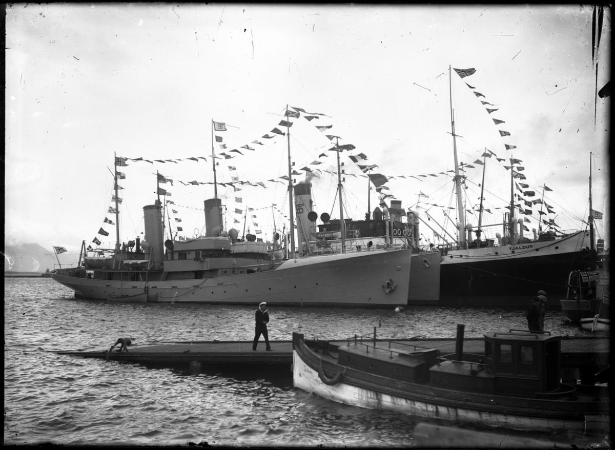 Skip skreytt fánum í höfn. Ma. Tjaldur. Varðskipið Ægir liggur yst, sennilega Óðinn þar bakvið, 1930.