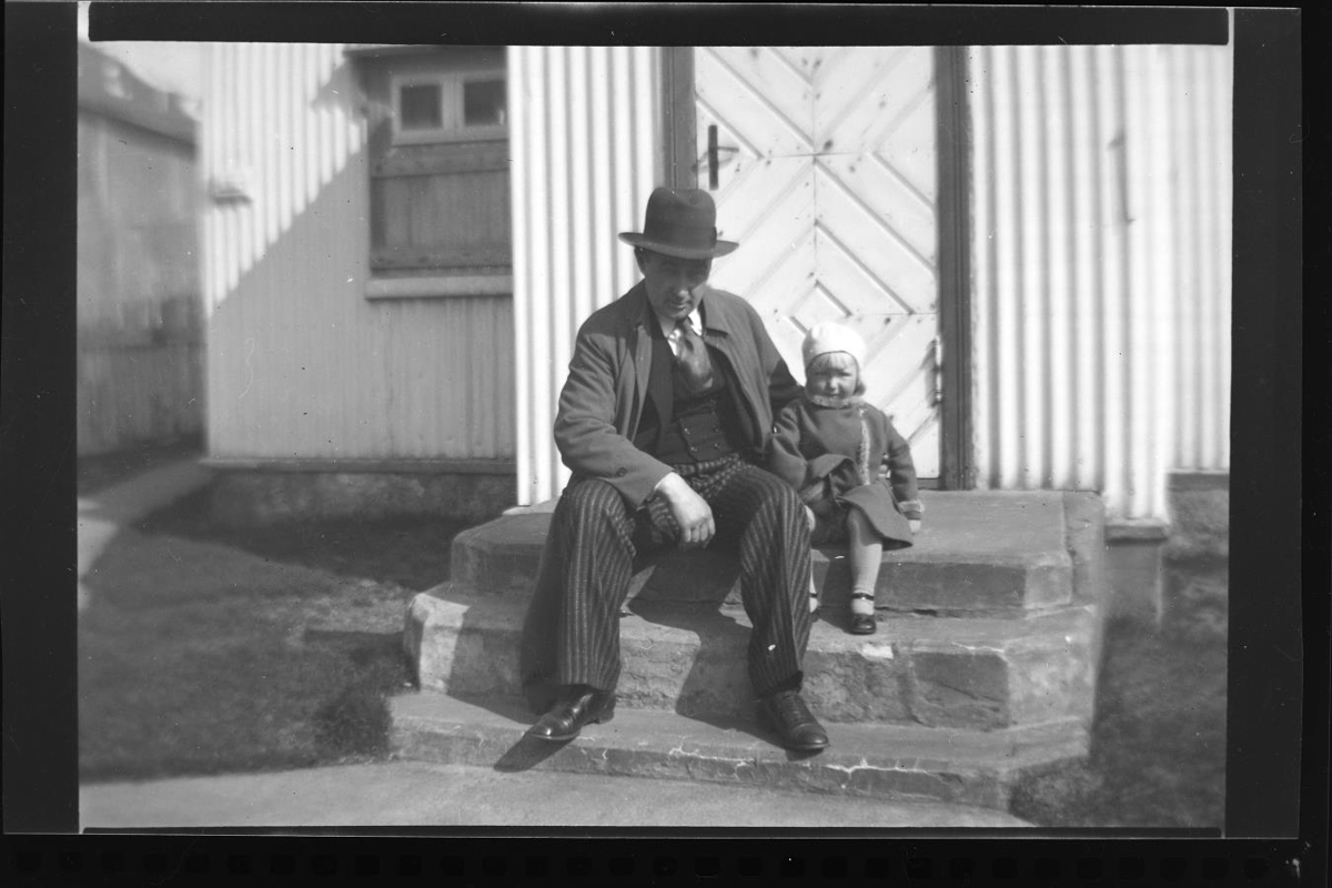 telpu á steyptum húströppum. Einar og Dóróthea. Kirkjutröppur.