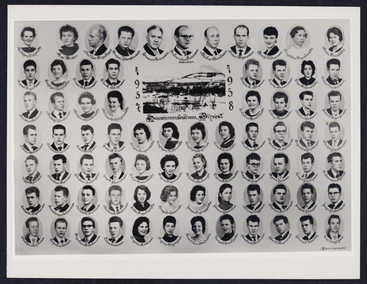 Guðmundur Sveinsson, skólastjóri; Gunnar Grímsson, kennari; Snorri Þorsteinsson, kennari; Halldór Sigurðsson, kennari; Åse Blæhr, kennari; Hörður Haraldsson, kennari; Hróar Björnsson, kennari; Beryl Kolbeinsson, kennari; Ingveldur Sigurðardóttir,