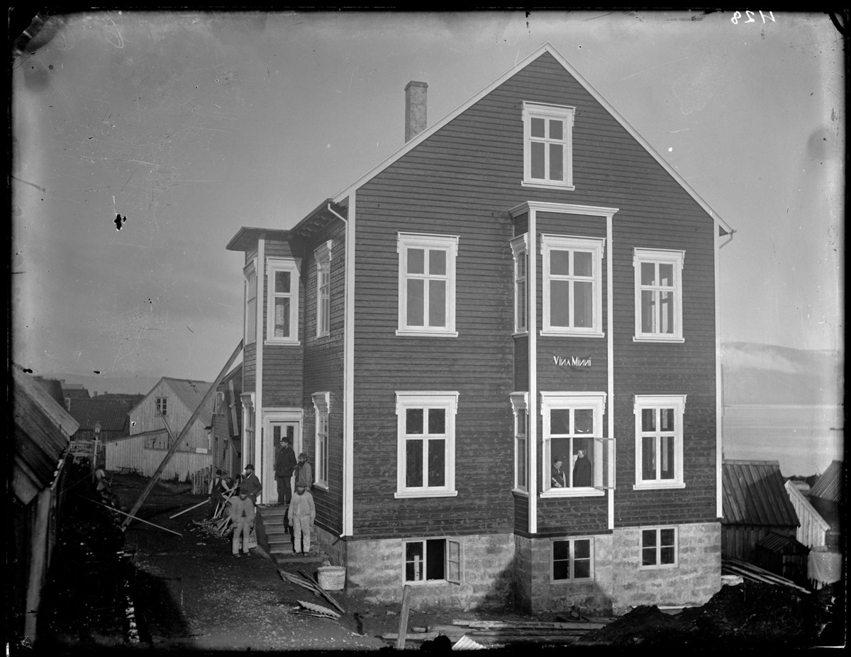 Timburhús á þrem hæðum með steinhlöðnum kjallara. Sex menn líklega iðnaðarmenn standa á tröppum hússins, sem er nýreist sbr. timbur ofl. við húsið og ekki enn tekið í notkun. 2 konur eru við glugga á neðri hæð hússins. Sér í nærliggjandi hús og út á sjó. Einnig í rennu, standlukt ofl.