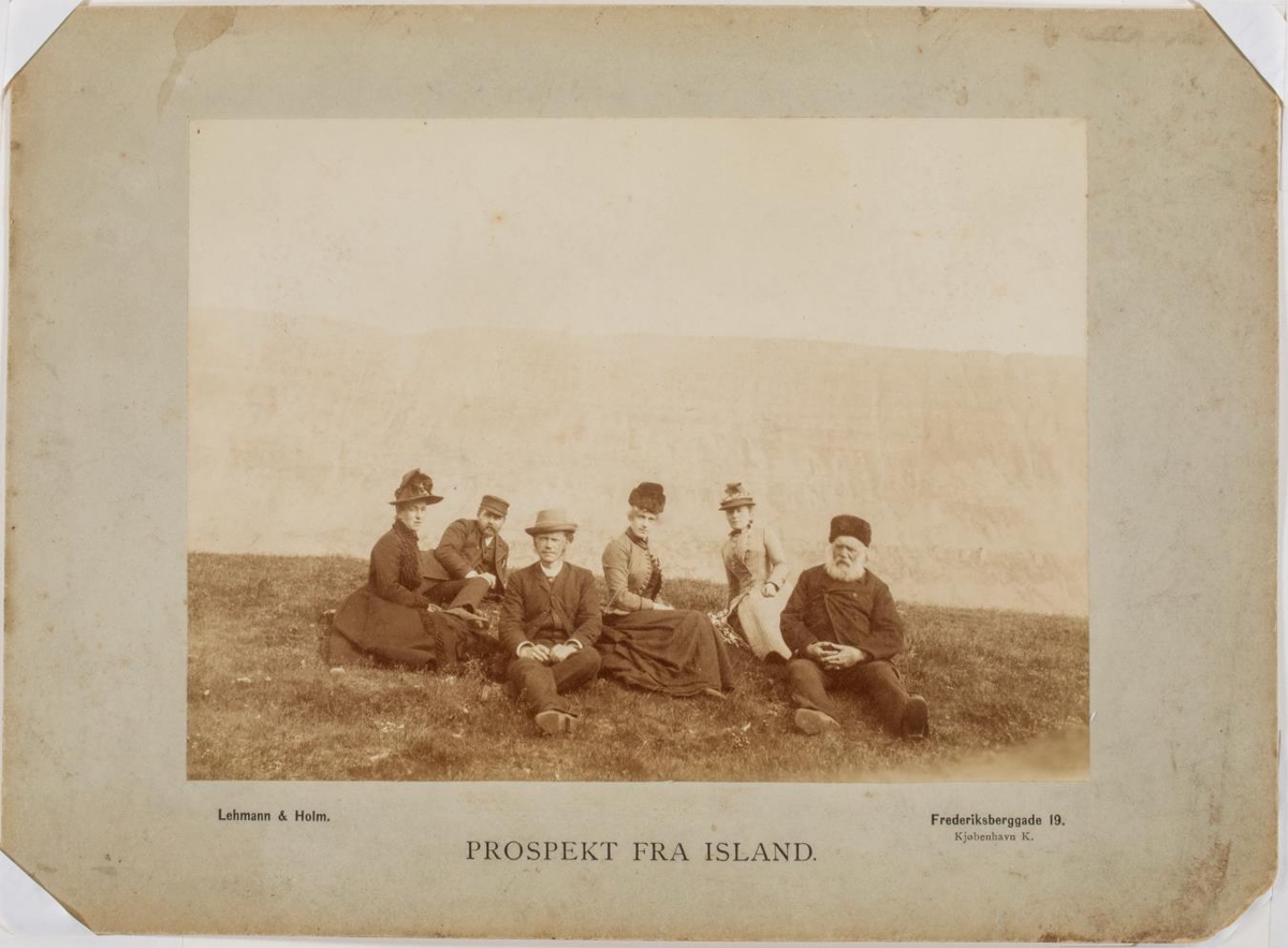 6 manns sitjandi á víðavangi (í skemmtiferð?).