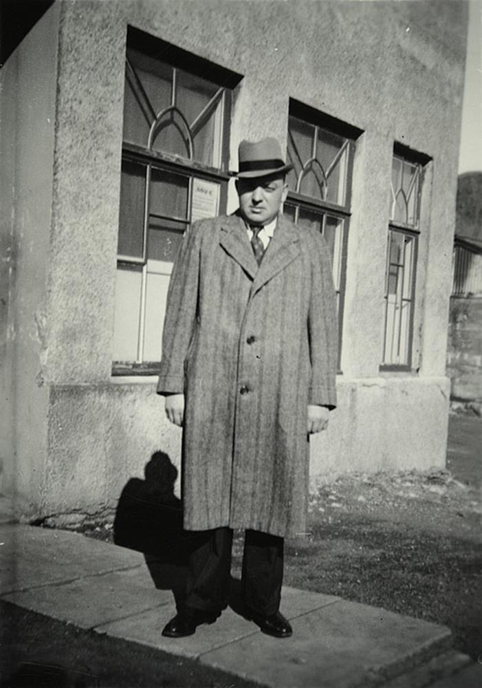 Vörpulegur þéttholda maður á miðjum aldri stendur á stéttinni fyrir framan inngang að e k. samkomuhúsi, sennilega í Vestmannaeyjum. Hann er í hnésíðum gráröndóttum frakka yfir ljósri skyrtu og hálsbindi, íklæddur dökkum buxum og skóm og með gráleitan hátt á höfði.