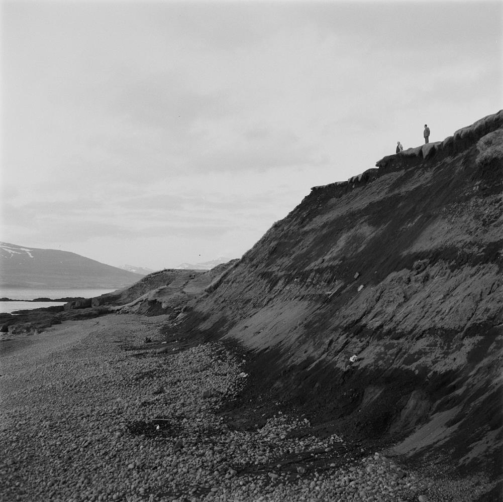 Brotbakkinn í Saurbæ, sjórinn brýtur kirkjugarðinn. Jón Jónsson frá Þjórsárholti og Jóhann Briem listmálari.
