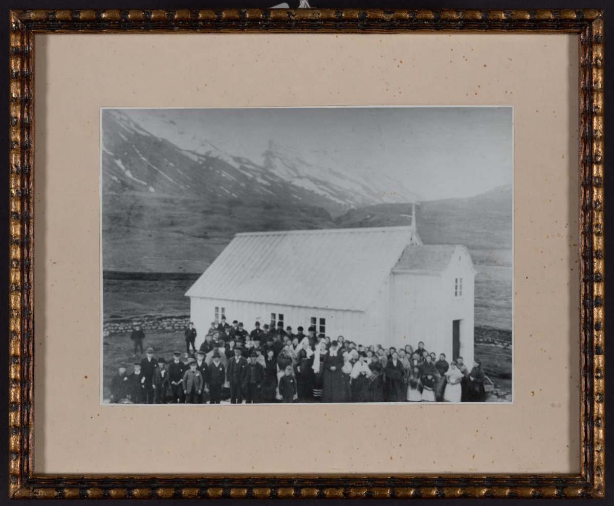 Kirkjugestir og prestur við turnlausa timburkirkju. Fjöll í baksýn.