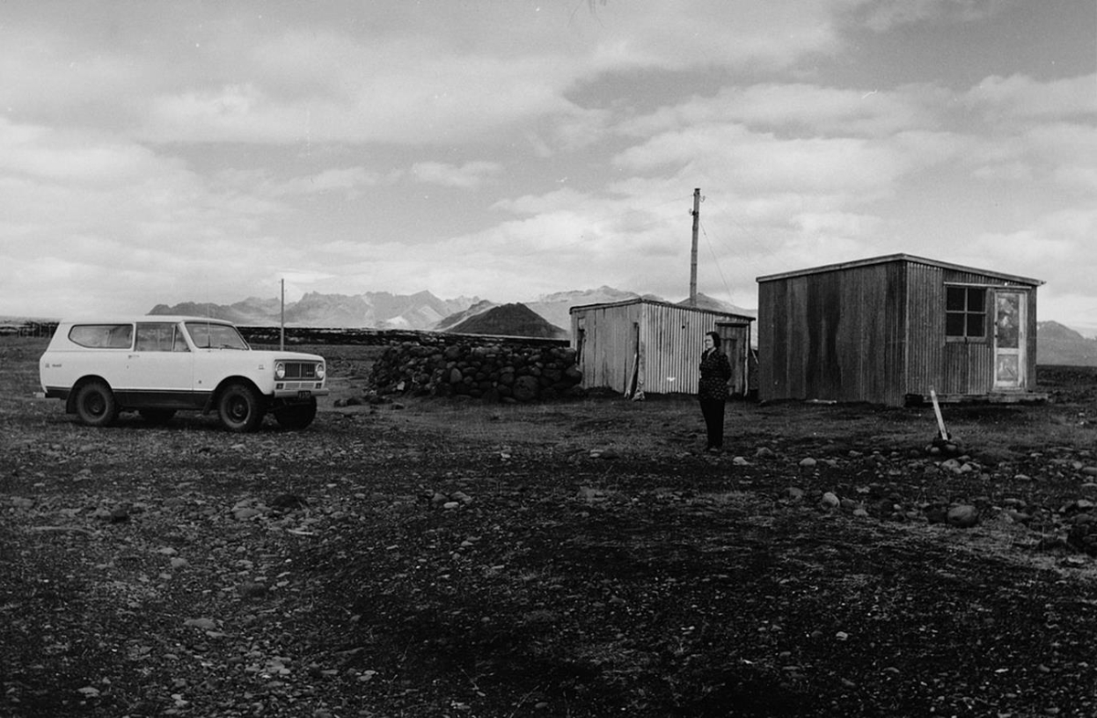 Kona stendur framanvið skúrana, símalína liggur að þeim bakatil. Í bakgrunni