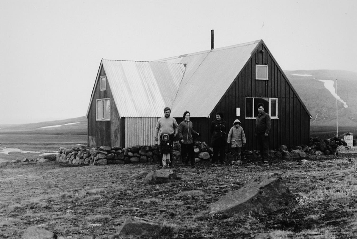 framanvið fjallaskála úr timbri og bárujárni.