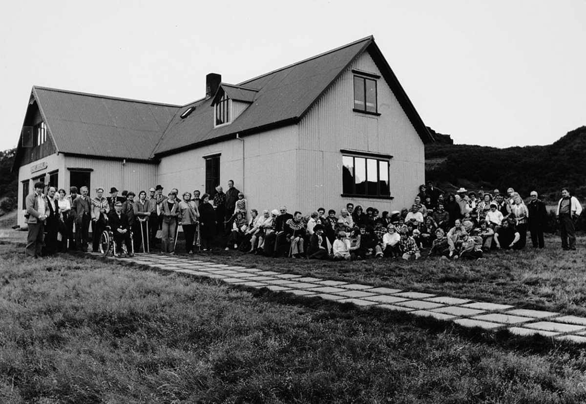 upp við allstóran bárujárnsskála til myndatöku.