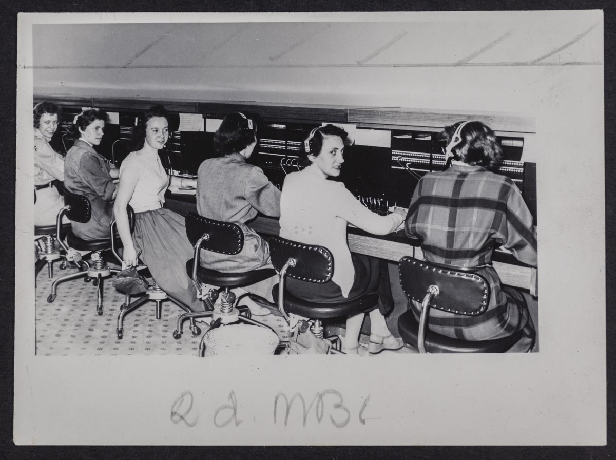 símaborð. Þær hafa heyrnartól á höfði. Undir myndinni stendur m.a.: „Þessar