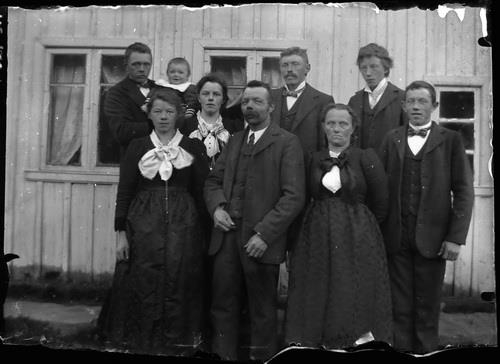 Fjölskylda - sama og 146. Fremst f.h. Guðfinna Pétursdóttir og Stefán Hallgrímsson, bjuggu á Glúmsstöðum 1841-1910, þá Björg Stefánsdóttir. Aftari röð: Gunnar Sigurðsson b. Egilsstöðum heldur á Snorra, Bergljót Stefánsd. kona hans, Hallgrímur Stefánsson b. á Glúmsstöðum, Þórarinn Stefánsson b. Þorgerðarstöðum, Friðrik Stefánsson b. á Hóli.