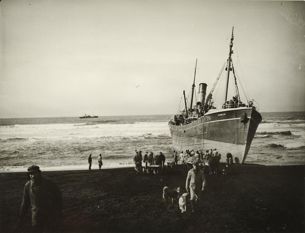 Strandaður togari uppí fjöru. Skip úti við sjóndeildarhringinn. Hópur björgunarmanna í fjöru. Frá strandi enska togarans Mohican H. 391 frá Hull. Varðskipið Ægir komið á vettvang til að freista þess að ná togaranum út.
