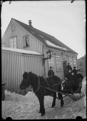 áföstu stóru ljóskeri. Framan við húsið er fólk á stórum sleða sem