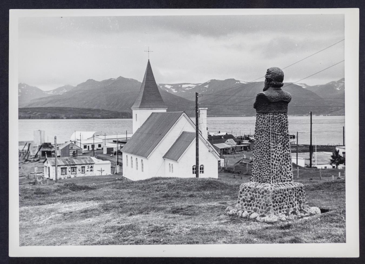 Þorpið, fjörður og fjöll í baksýn. „Hákarla Jörundur stendur aftan á“.