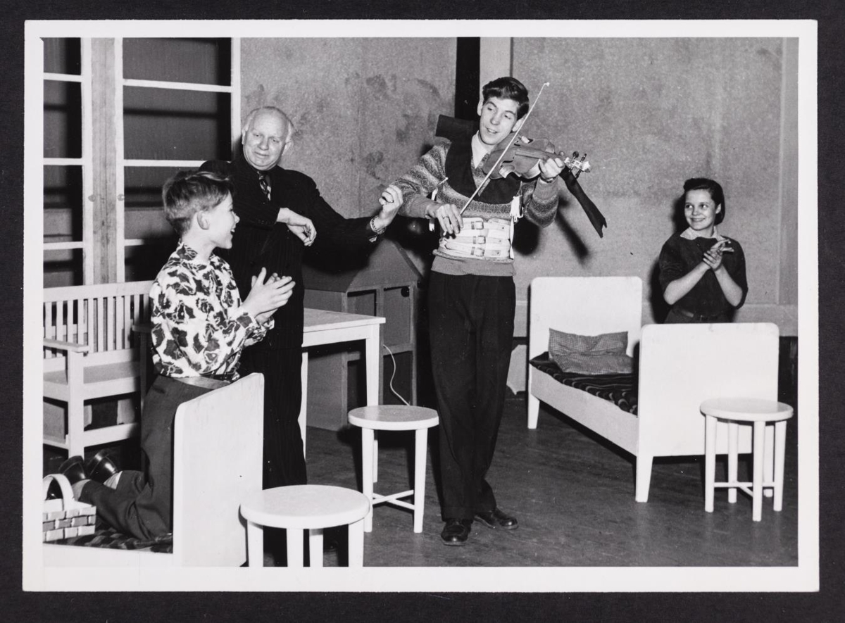 einn þeirra heldur á fiðlu. Fiðluleikarinn er Bessi Bjarnason, leikari.