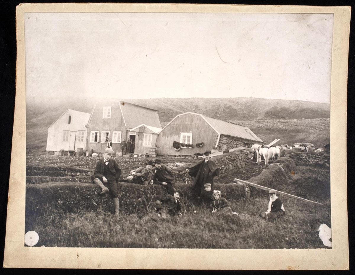 Ferðamenn á við sveitabæ. Kárastaðir í Þingvallasveit. Maðurinn í slagkápunni er sr. Ólafur Ólafsson fríkirkjuprestur - Einar Halldórsson bóndi í bæjardyrum - Hannes Þorsteinsson þjóðskjalavörður situr í grasinu f. miðju.