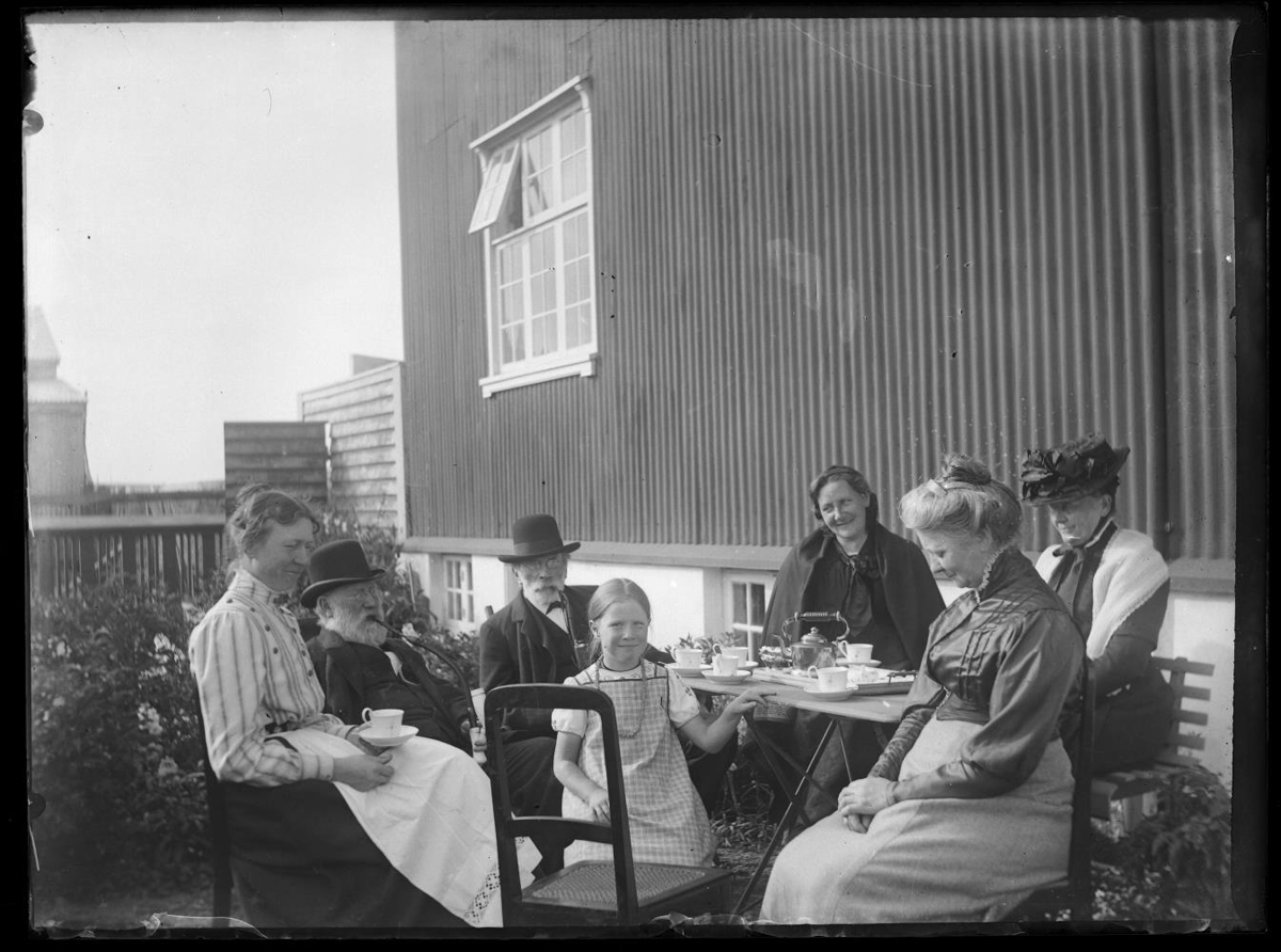 Fólk situr úti í garði við borð og drekkur te við bárujárnsklætt hús. Bollar,
