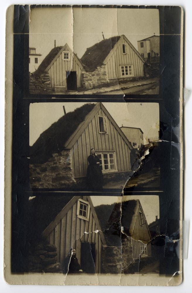 bursta torfbæ í þéttbýli. Kona stendur við bæinn á tveim myndanna.