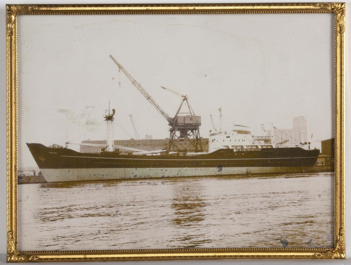 Innrömmuð ljósmynd af vöruflutningaskipinu Selfossi við bryggju í erlendri höfn. Skipið er annað hvort Selfoss I eða Selfoss II. Myndin var í eigu bróður gefanda, Sveinbjörns Sigvaldasonar. Sveinbjörn var skipverji á Hamrafelli og líklega eitthvað á Selfossi. Hann drukknaði 18 ára gamall í höfninni í Hafnarfirði að sögn gefanda.