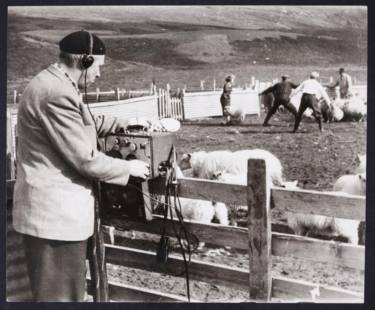 Í réttum. Gísli Kristjánsson (?) ráðunautur tekur upp hljóð.