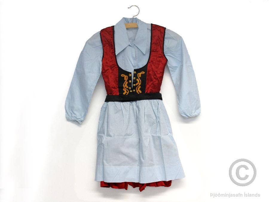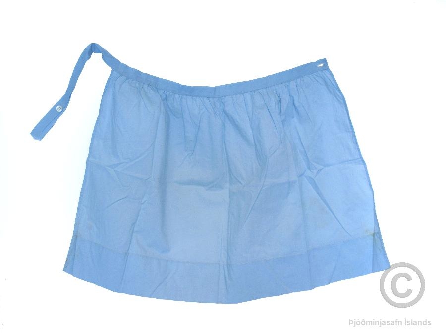 Svunta úr ljósbláu lérefti sem fylgir telpuupphlut nr. Þjms. 2011-9-8. Svuntan er hneppt vinstra megin að aftan með hvítri plasttölu. Í henni eru smávægilegir blettir en annars er hún í mjög góðu ástandi. Auk svuntunnar fylgja búningnum blússa (Þjms. 2011-9-9) og belti (Þjms. 2011-9-11). Búningurinn er af gefanda frá því hún var 6 ára gömul. Búningurinn var saumaður af móður hennar, Svövu Guðjónsdóttur frá Kýrunnarstöðum (f. 1903) og móðursystur, Þuríði Guðjónsdóttur frá Kýrunnarstöðum (f. 1905). Þær systur saumuðu slíka upphlutsbúninga á gefanda og tvær systur hennar árið 1952 í tilefni sextugsafmælis frænda þeirra, Jens Bjarnasonar í Ásgarði (f. 3.6.1892). Þær voru frá áramótum 1951/1952 að sauma búningana. Þær höfðu lært að sauma af móður sinni, Sigríði Jónsdóttur á Kýrunnarstöðum (f. 1875) en hún hafði numið að Ytri-Ey, rétt fyrir aldamótin 1900. Upphluturinn er í góðu ástandi. Sjá einnig búning nr. Þjms. 2011-9-12, 13, 14, sem er af systur gefanda. Búningur þriðju systurinnar, Sigríðar, hefur ekki varðveist. Einnig fylgja afgangar af efnunum sem notuð voru í saumaskapinn (Þjms. 2011-9-15).