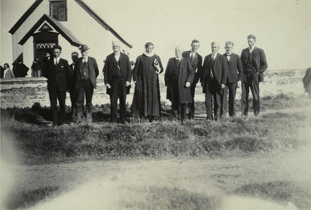 upp til myndatöku og er einn í prestshempu. Í baksýn t.v. sér í sveitakirkju.