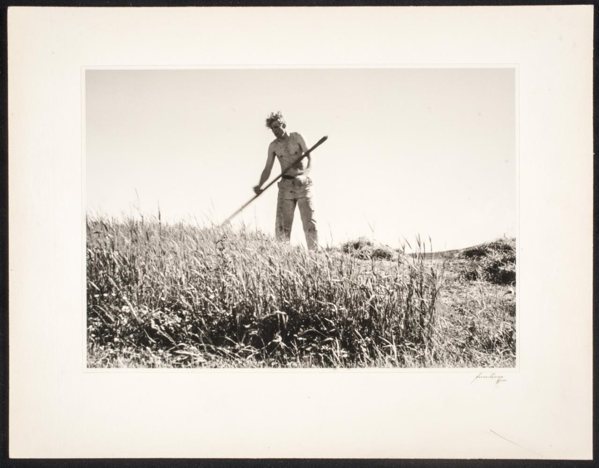 Myndin sýnir ungan karlmann við slátt með orfi og ljá. Hann er í hvítum buxum og ber niður að mitti.