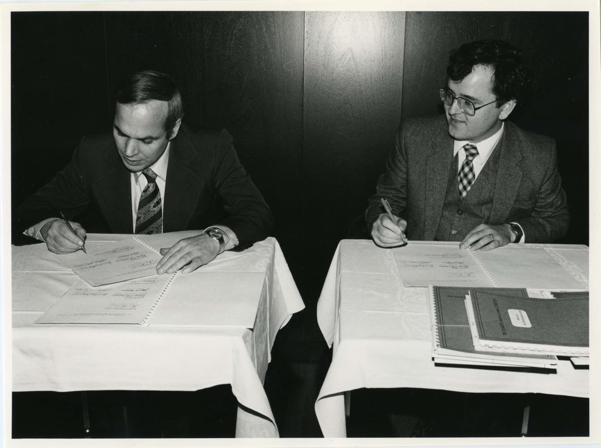 er til hægri. Hér er sennilega um að ræða undirritun á samningi um smíði