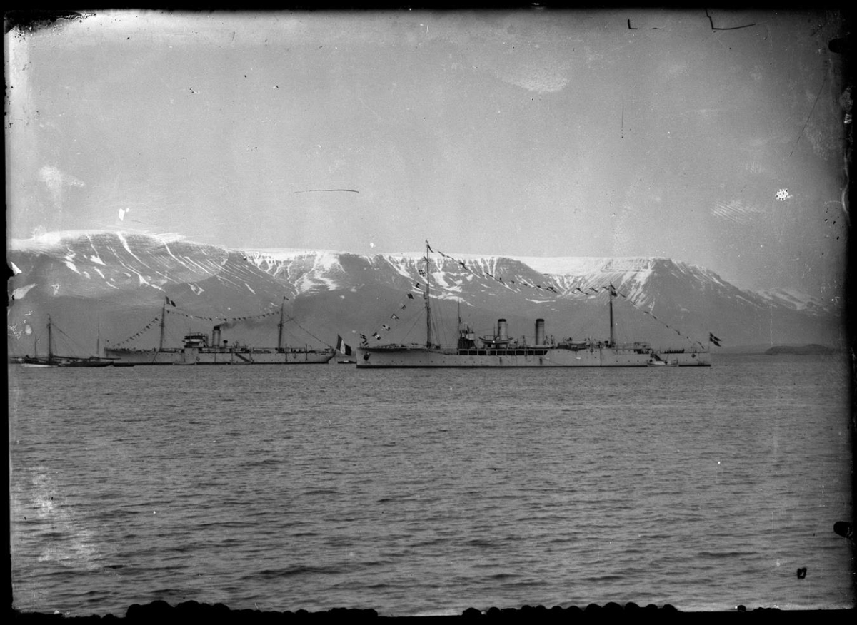 „Mynd frá þriðja áratugnum. Lengst til vinstri er kútter. Ef hann er íslenskur er myndin tekin fyrir 1926 þegar kútteraútgerð lagðist af. Skipið í miðið er franska eftirlitsskipið Ville d´Ys. Aftan við það er danska varðskipið Fylla.“ „Númer kúttersins lítur út fyrir að vera FD sem er Fuglafjörður í Færeyjum, en það segir ekkert af eða á því kútterar þaðan voru hér öll millistríðsárin. Tímamörk myndarinar eru því 1921-28.“ (BÞ 2016)