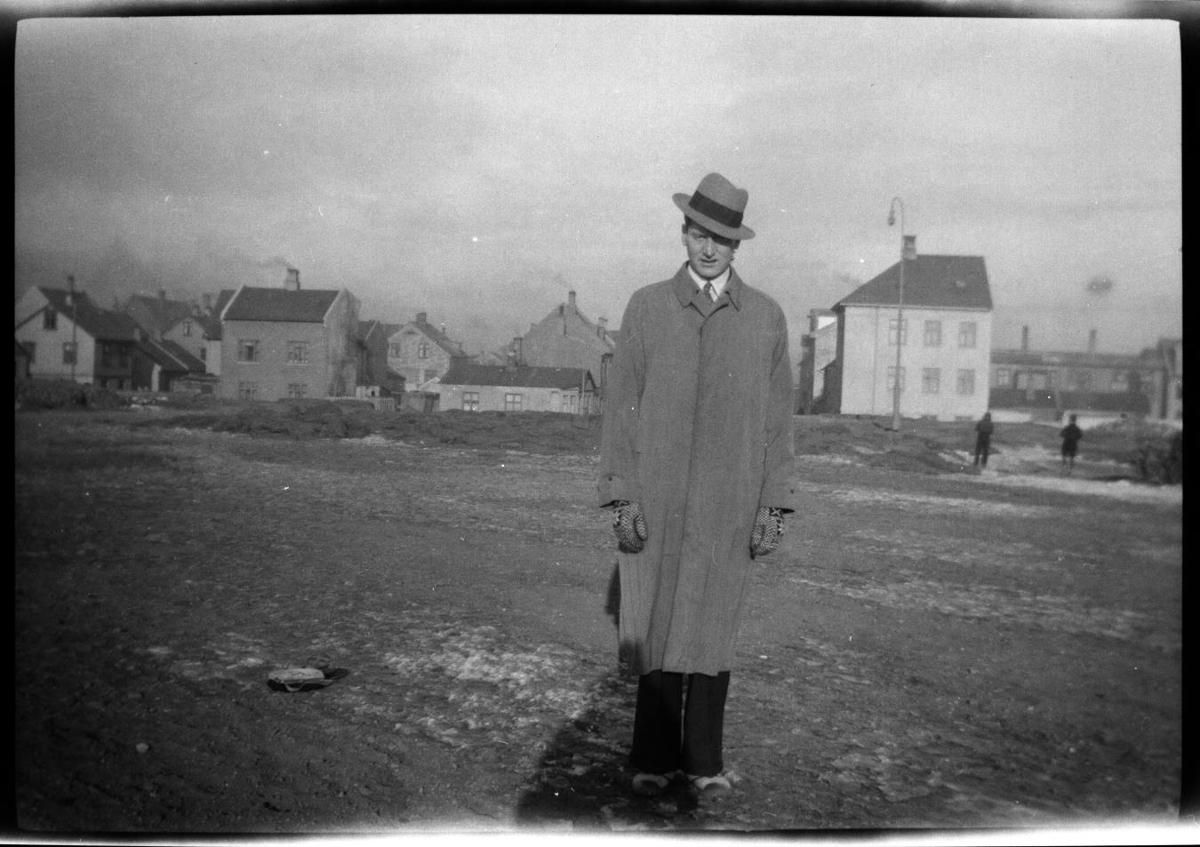 Maður stendur í forgrunni. Vilhjálmur Kristjánsson frá Skerðingsstöðum.